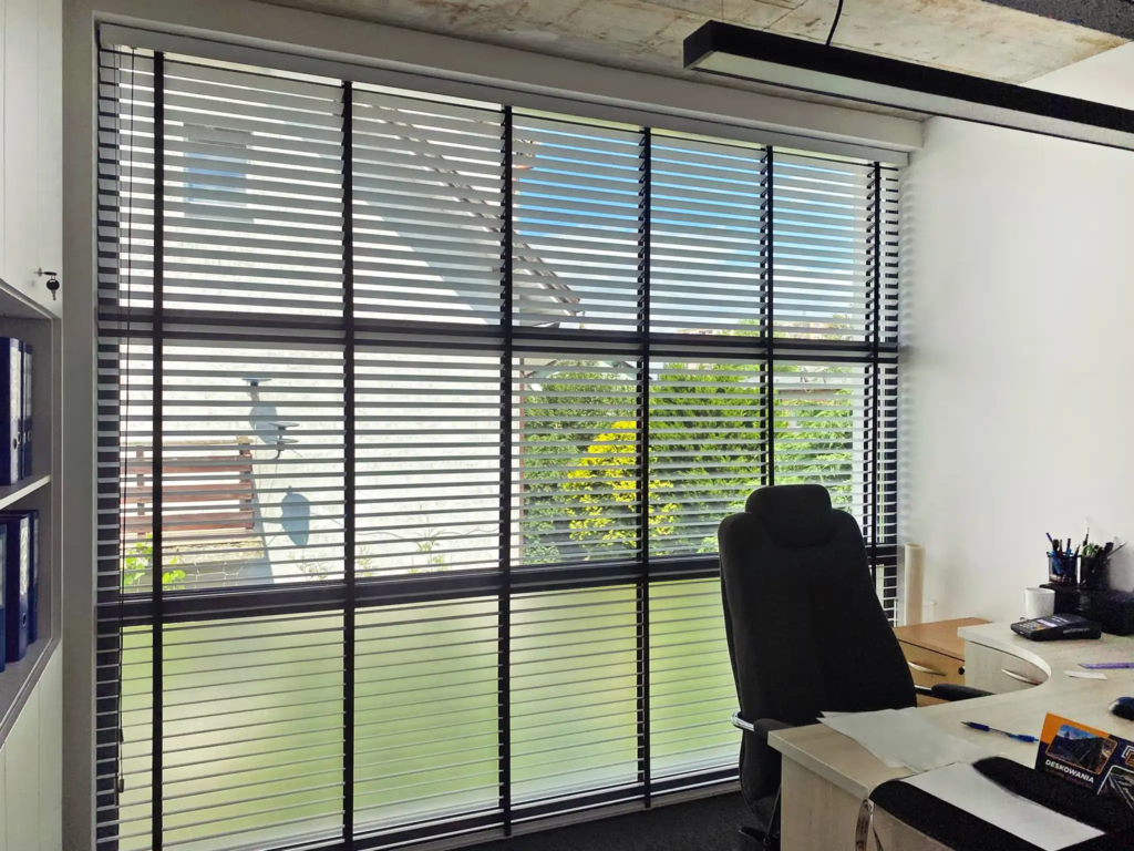 - Łatwość utrzymania w czystości i higiena – aluminium można łatwo czyścić z kurzu, a lamele można codziennie przemywać lub dezynfekować antyseptykami, co sprawia, że żaluzje są higieniczne i bezpieczne w użytkowaniu, zwłaszcza w biurach i placówkach medycznych.