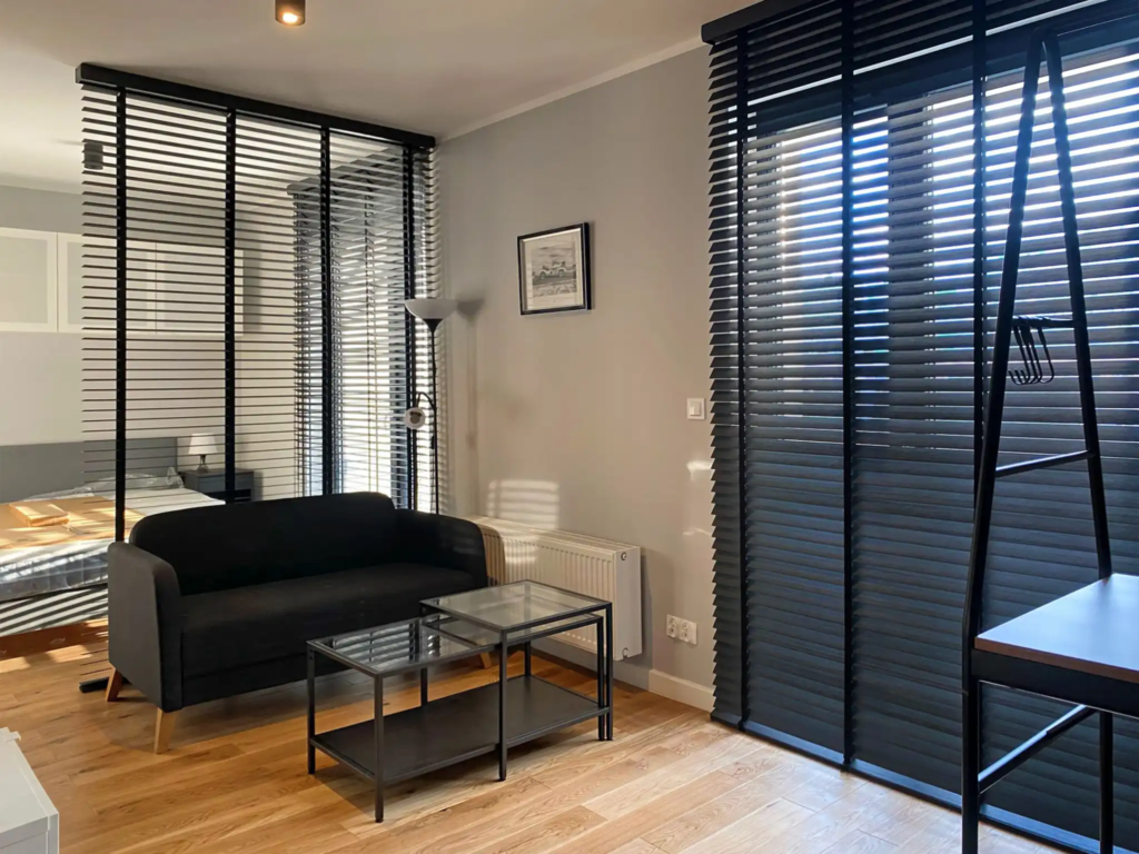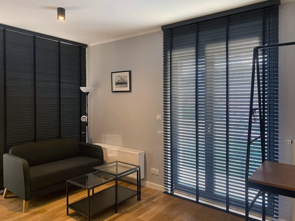 Żaluzje drewniane – rekomendowane do salonów, sypialni i prestiżowych przestrzeni, szczególnie przy dużych przeszkleniach lub jako element dekoracyjny lub przegrodowy.